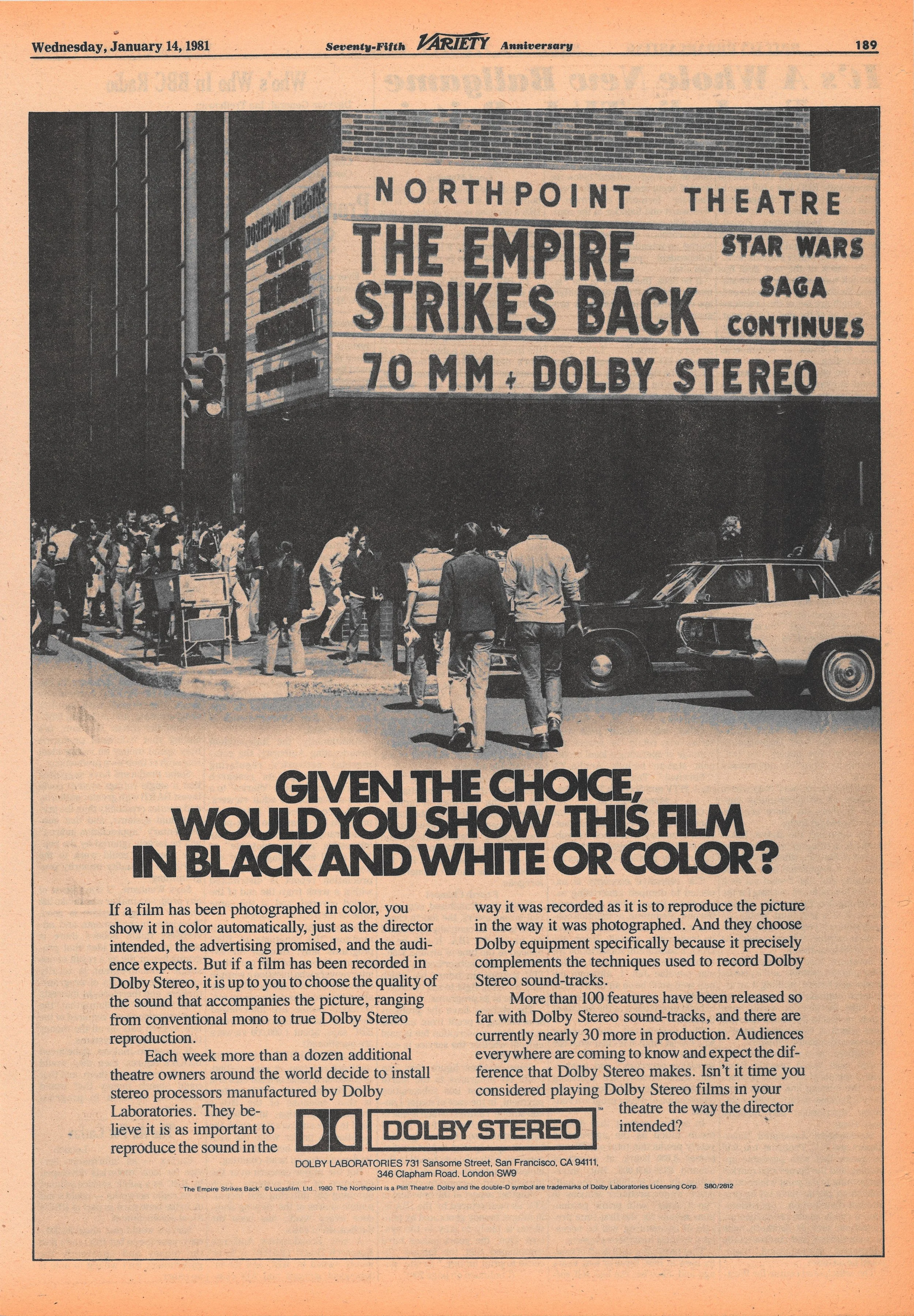 As was often the case during the heyday of the Original Trilogy, significance was placed on 70mm projection and 6-track Dolby Stereo from theaters that offered such enhancements to their customers. The Empire Strikes Back’s first month on screens was solely in this format (a few drive-in bookings notwithstanding) before expanding widely in 35mm. Dolby Laboratories ended up utilizing Empire’s 70mm Dolby Stereo run at the Northpoint in a print ad campaign, aptly posing theater owners the question, “Given the choice, would you show this film in black and white or color?” The push to reproduce “the picture in the way it was photographed” with “the sound in the way it was recorded” placed the onus on theaters to present movies the way their directors intended, as audiences “everywhere are coming to know and expect the difference that Dolby Stereo makes.”