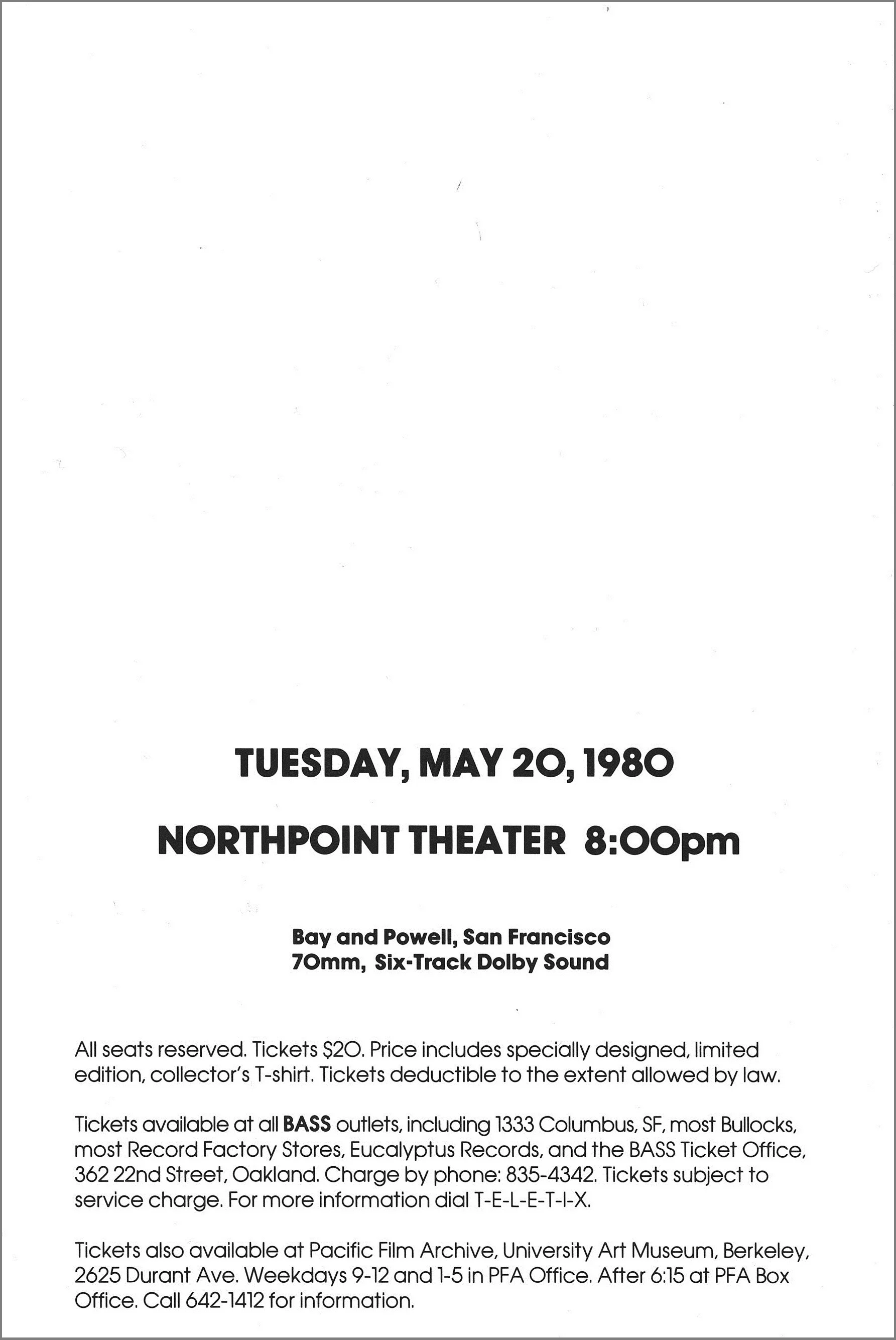As advertised by the flyer below, the film’s Northern California Benefit Preview was hosted at the Northpoint on the night of Tuesday, May 20th. Tickets were available for $20 each, with funds raised to help match the National Endowment for the Arts Challenge Grant to Berkeley’s University Art Museum and Pacific Film Archive.