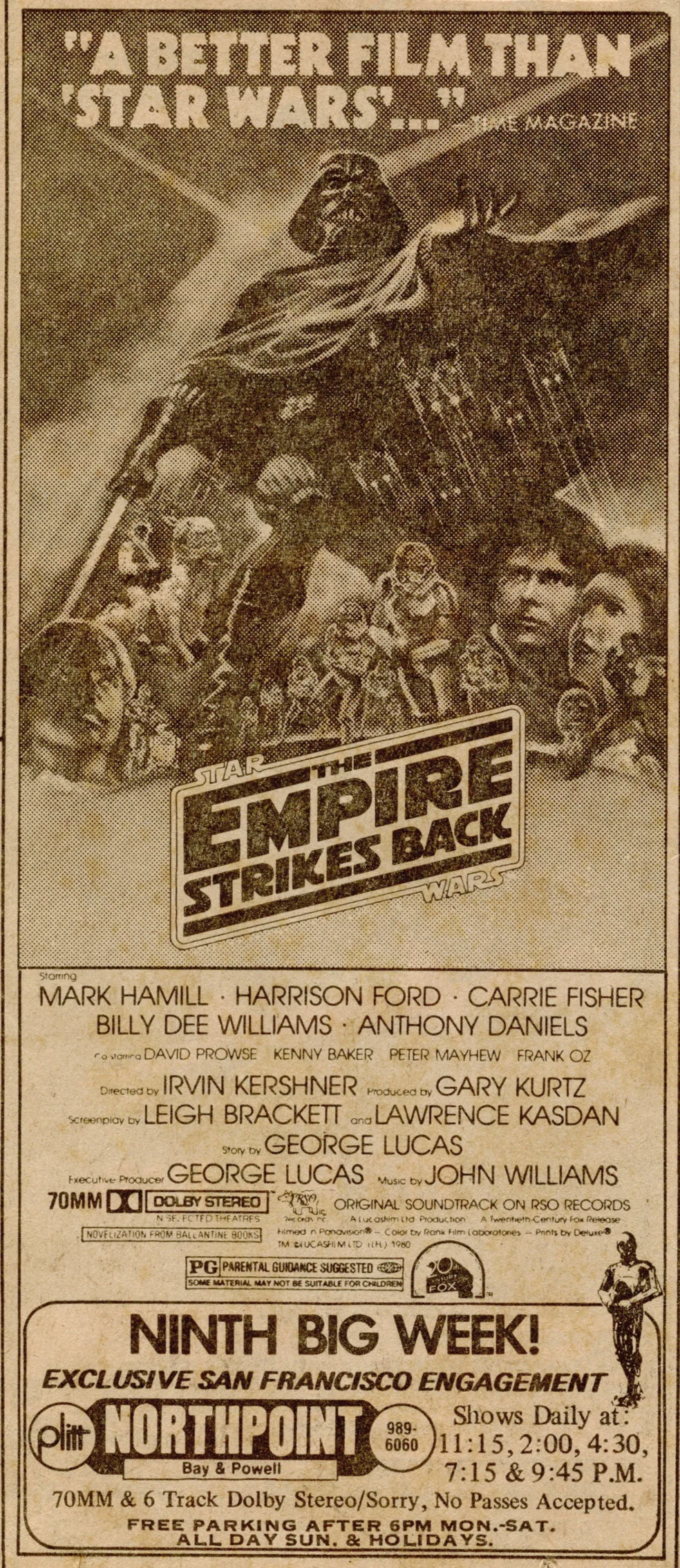 The newspaper ad to the left ran during the Northpoint’s “NINTH BIG WEEK” as San Francisco’s exclusive engagement of the movie. Empire would go on to play there for an impressive 28 weeks, appropriately being supplanted by the remake of its cinematic forebear Flash Gordon on December 5th, 1980.